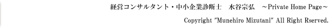 “志”を“信頼”で結ぶ プライベートコンサルティングネットワーク このホームページは、経営コンサルタント・中小企業診断士 水谷宗弘が、目標達成のためのスキルや目標管理に役立つ情報提供を無料で行うことにより、企業の業績改善や個人の自己実現のサポートすることを目的とする非営利目的のプライベートホームページです。一人でも多くの方々が、目標作成・目標管理のスキルを身につけ、夢を実現することを支援することを自分自身の喜びとし、情報発信していきたいと思いますので宜しくお願いいたします! 経営コンサルタント・中小企業診断士 水谷宗弘